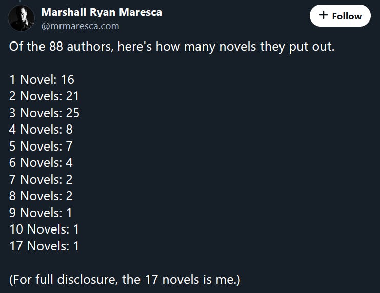 Essentially it comes down to this - 70% of those 88 authors have published 3 or fewer books. Less than 10% of the 88 have published more than 6 books. Those figures more or less (60% and 10% respectively) match data that Jane Friedman collated from the Fiction Database (which is genre agnostic) in around 2021 and that she talks about here.