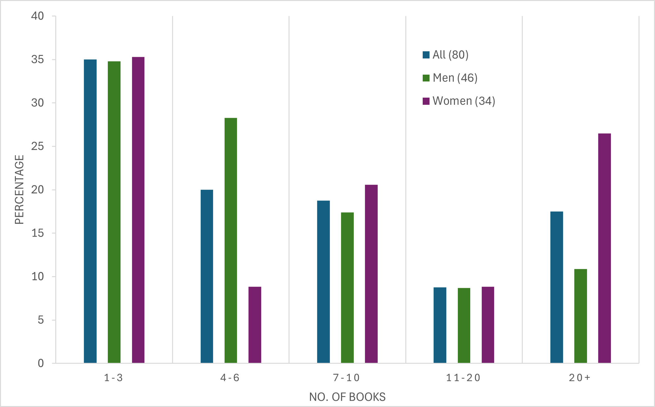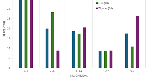 I started, in a fit of enthusiasm, looking at differences between men and women, and between books that are obviously centring marginalised identities versus those that aren’t. These kinds of comparisons would be so revealing and useful, I think, but honestly my numbers are too small to carry any water. All I’ll say is that from my quick look, I would expect differences to emerge, and that’s an important thing to contemplate. Here, for example, is the breakdown by (binary, I’m afraid) gender:
